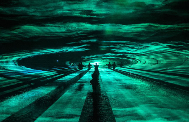 烽煙三國是以萬里長江為背景、以三峽港灣為舞臺、以三國文化為主題、以忠義精神為靈魂的文化饕餮盛宴。她是長江三峽唯一一場以三國歷史為背景的實景大戲,是當今世界唯一一個以戰爭為題材的山水實景演藝。烽煙三國通過35000平方米大場景水上舞臺、3200平方米水幕投影和3D全息式投影、300米大跨度高速威亞、五虎上將石柱大型舞臺機械、180度環形移動觀眾座椅、驚艷的水火特技, 以及300多名演員、50多匹戰馬,截取關羽忠義一生的重點歷史場景,如桃園結義、下邳鄧降、身陷曹營、單刀赴會、火燒赤壁、千里走單騎、水淹七軍等,演繹了一場驚天動地的忠義之舉,一段流芳百世的兄弟情懷,一幅金戈鐵馬的征戰畫卷,一部蕩氣回腸的英雄史詩。場面宏大,氣勢震撼,激蕩心靈。