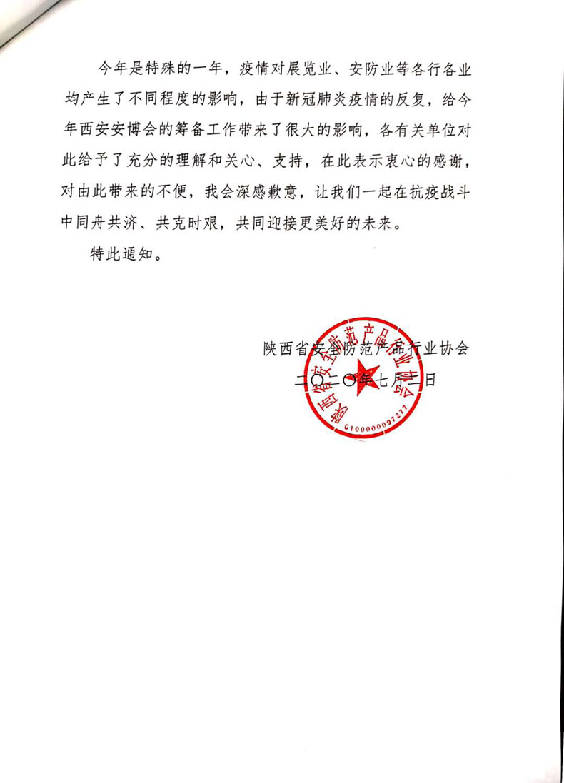 為了配合做好疫情防控工作,切實保障參會代表、參會人員的生命安全和身體健康,維護參展單位的權益,確保展覽效果,經與各協作方商量,我會決定延期舉辦原定于2020年7月27日至29日在西安國際會展中心(浐灞)舉辦的西安安博會,具體舉辦時間另行通知。