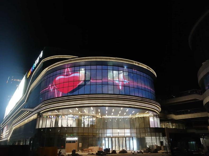 led貼膜屏貼玻璃幕墻安裝,透明樣式,不影響建筑外觀,也常用于機場、車站等場合,像一些玻璃走廊欄桿,也可以安裝led貼膜屏用于亮化、美化商場、廣告展示。南京吾悅廣場項目選用了大元智能戶外P10貼膜屏,弧形安裝、因為led貼膜屏本身帶有一定的韌性,所以在弧形建筑上,安裝并不帶有很大難度。此項目700多平。