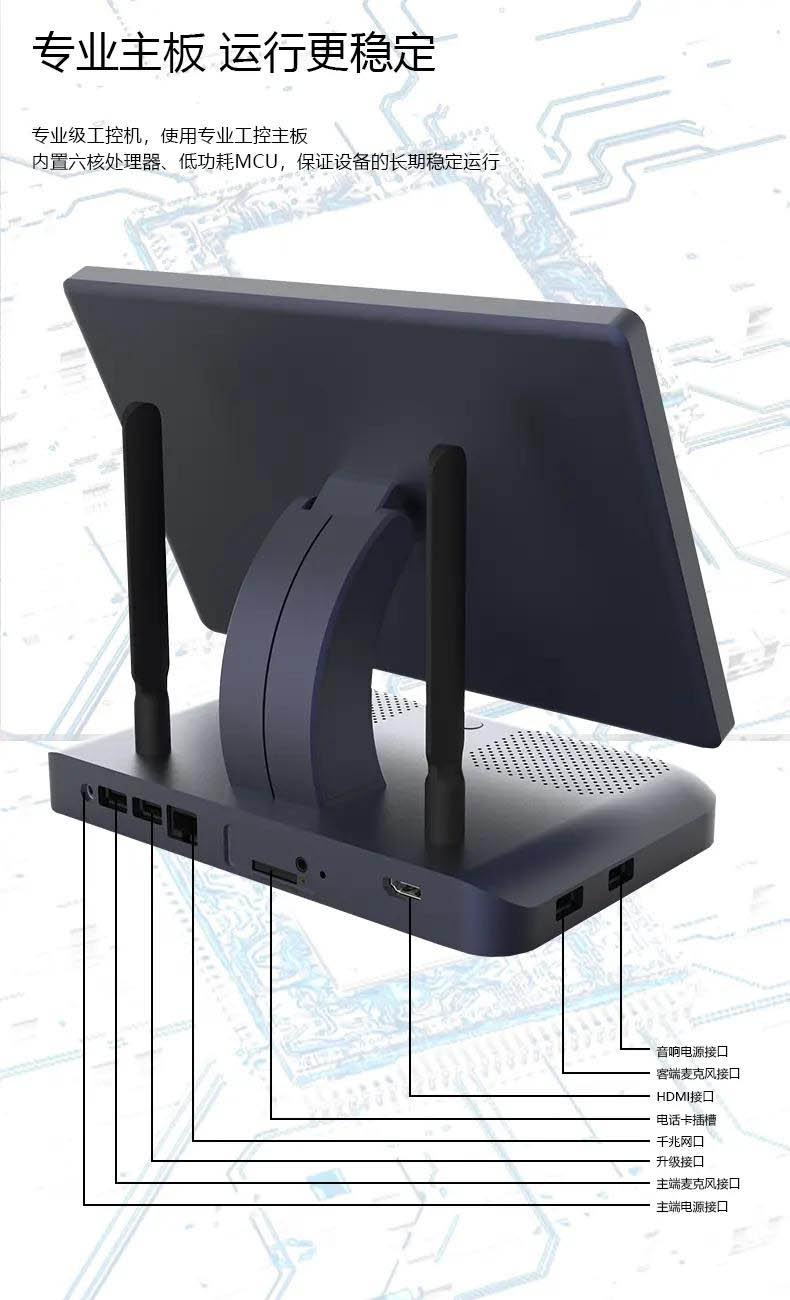 外雙大屏設(shè)計(jì),10.1寸超高分辨率大屏,屏幕更大更清晰,印有金屬感華光昱能“Dako”品牌LOGO,高端大氣,雙重立體環(huán)繞音響,嘈雜環(huán)境聲音依然清晰,雙頻高速 WiFi 模塊,毫秒級(jí)延遲,語(yǔ)音播報(bào)「零」卡頓,企業(yè)級(jí) 4G+ 通信模塊,三網(wǎng)通全號(hào)段支持,即插即用。