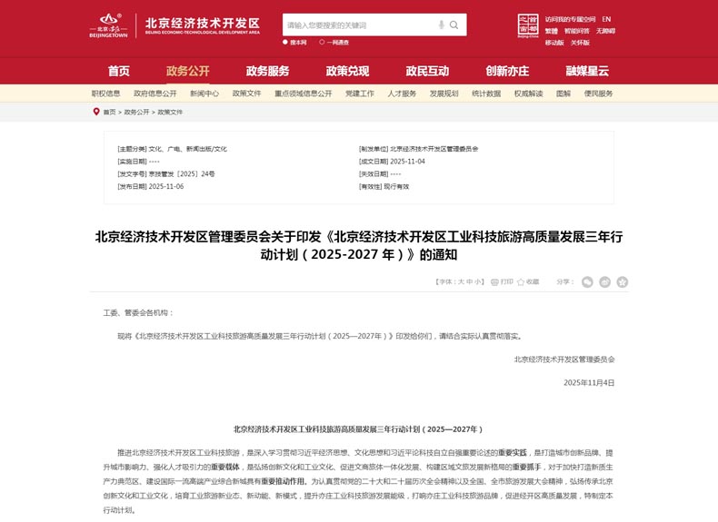11 月 6 日,北京經(jīng)濟(jì)技術(shù)開(kāi)發(fā)區(qū)管理委員會(huì)印發(fā)《北京經(jīng)濟(jì)技術(shù)開(kāi)發(fā)區(qū)工業(yè)科技旅游高質(zhì)量發(fā)展三年行動(dòng)計(jì)劃(2025-2027 年)》。