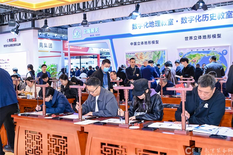 除了華文小奕機器人,華文眾合展位的核心產品第九代智慧書法教室和智慧粉筆教室同樣備受矚目,其傳統與科技的完美結合,引得教育工作者、高校領導及對書法感興趣的社會各界人士紛紛駐足參觀體驗。