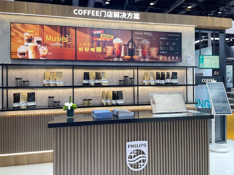 咖啡門店方案同樣引起廣泛關注。該三聯屏解決方案,使用數字標牌4357P系列打造,符合一級能耗標準,采用ELED背光設計,減少冗余材料及組件,保證卓越畫質的同時降低功耗,助力咖啡連鎖品牌打造“綠色門店”。配合吧臺屏、叫號屏,協同CMS信息發布系統、排隊叫號系統、收銀系統等,提升點單的便捷、有序。移動智慧屏一推即走,可根據客流動線或促銷活動靈活部署,保障宣傳信息高效觸達。