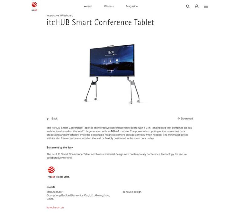 此次榮膺紅點設計大獎,不僅是對itcHUB智慧會議平板產品本身的褒獎,更是對保倫股份itc持續投入研發創新、追求設計卓越、致力于為用戶創造價值的充分肯定。它代表了國際設計界對itc品牌及產品的高度認可,是itc邁向國際化、引領行業發展的重要里程碑。