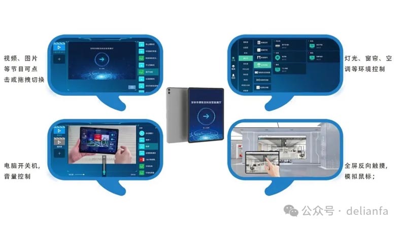 節目內容控制可視化,pad和屏端能同步顯示視頻、圖片、PPT等播放內容,并可反向觸摸控制電腦桌面。屏、播放電腦、燈光、空調等設備開關狀態實時反饋,一目了然。