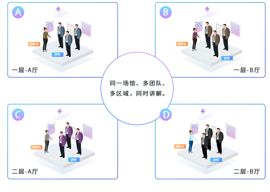 ◆ 講解員佩戴設備小巧美觀,攜帶方便,操作簡單;可對展廳內所有安裝團隊智慧講解接收機區域進行講解,無縫隙連接;