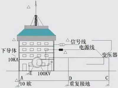 如下圖所示,當10kA的雷電流通過下導體入地時,我們假設接地電阻為4歐姆,根據歐姆定律,我們可知在入地點A處電壓為40kV。因A點與C、D點相連,所以這幾點電壓都為40kV。而E點接地,其電壓值為0,設備的D點與E點間有40kV的電壓差,足以將設備損壞。